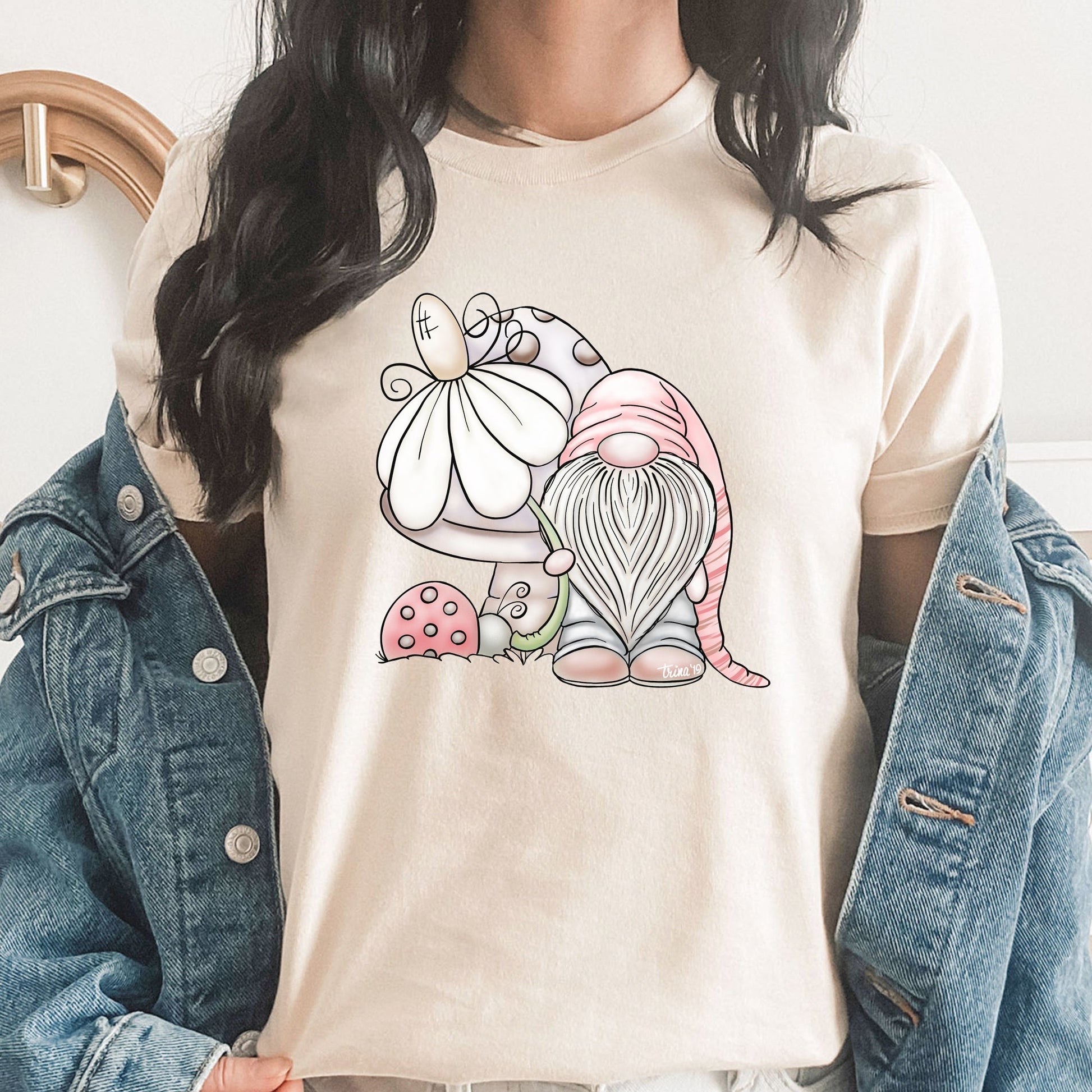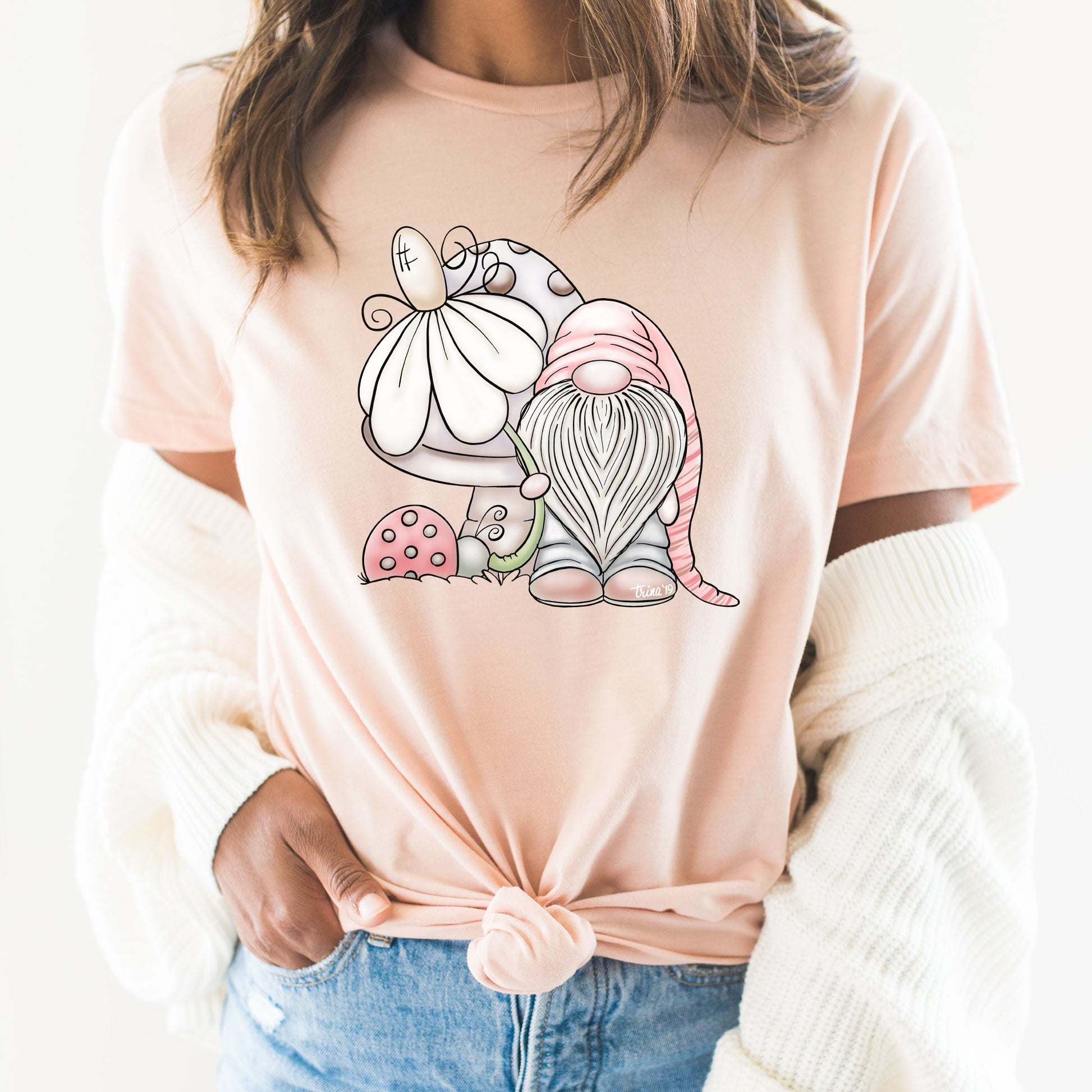 Pair it effortlessly with jeans, shorts, or your favorite casual bottoms for a look that exudes both comfort and a dash of enchantment. The graphic on this tee isn't just an image; it's a visual celebration of the magic found in the simple pleasures of nature and the delightful presence of whimsical gnomes.