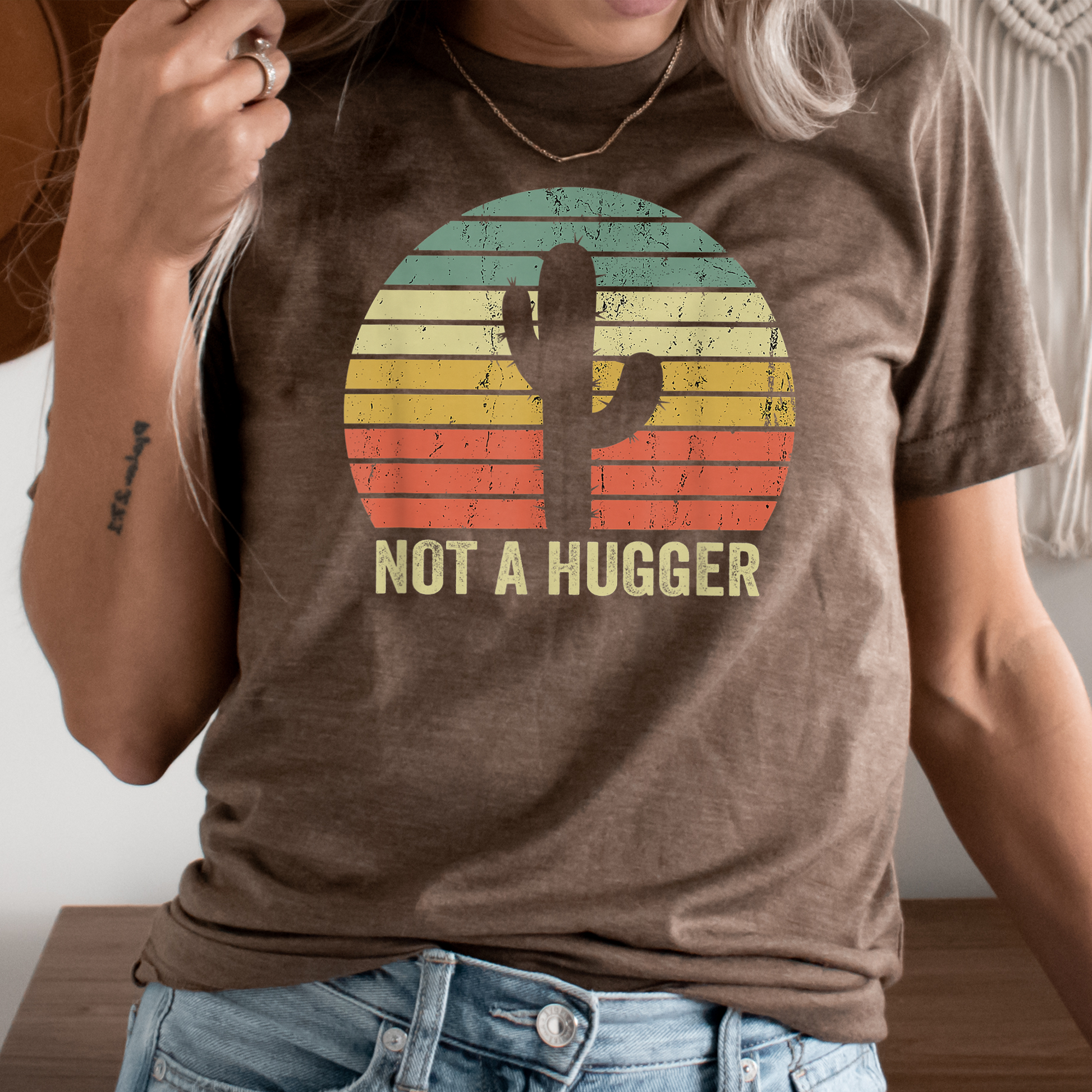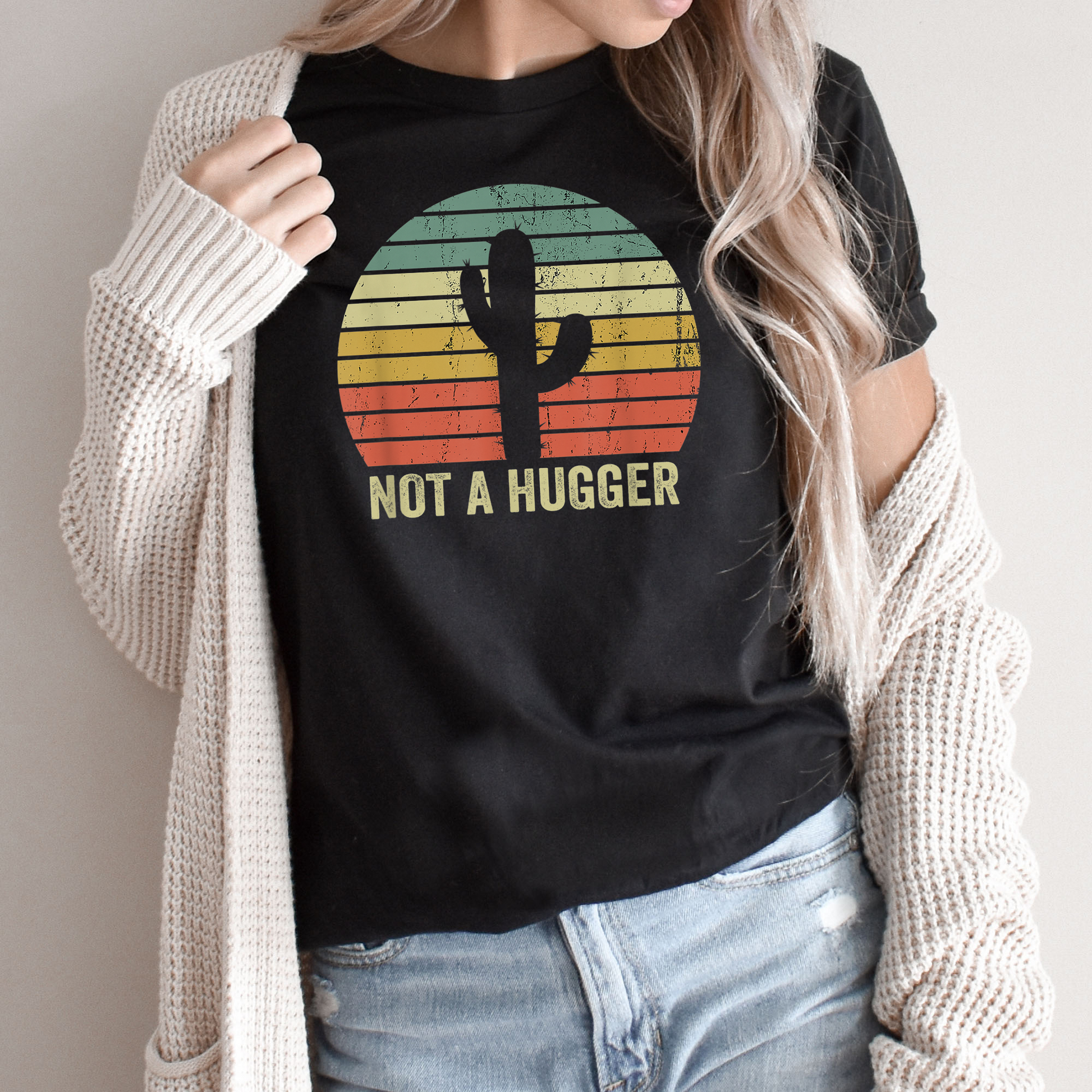 Not A Hugger Graphic Tee | Distressed Rainbow Stripes Cactus | Desert | Funny Sarcastic | Vintage | Retro