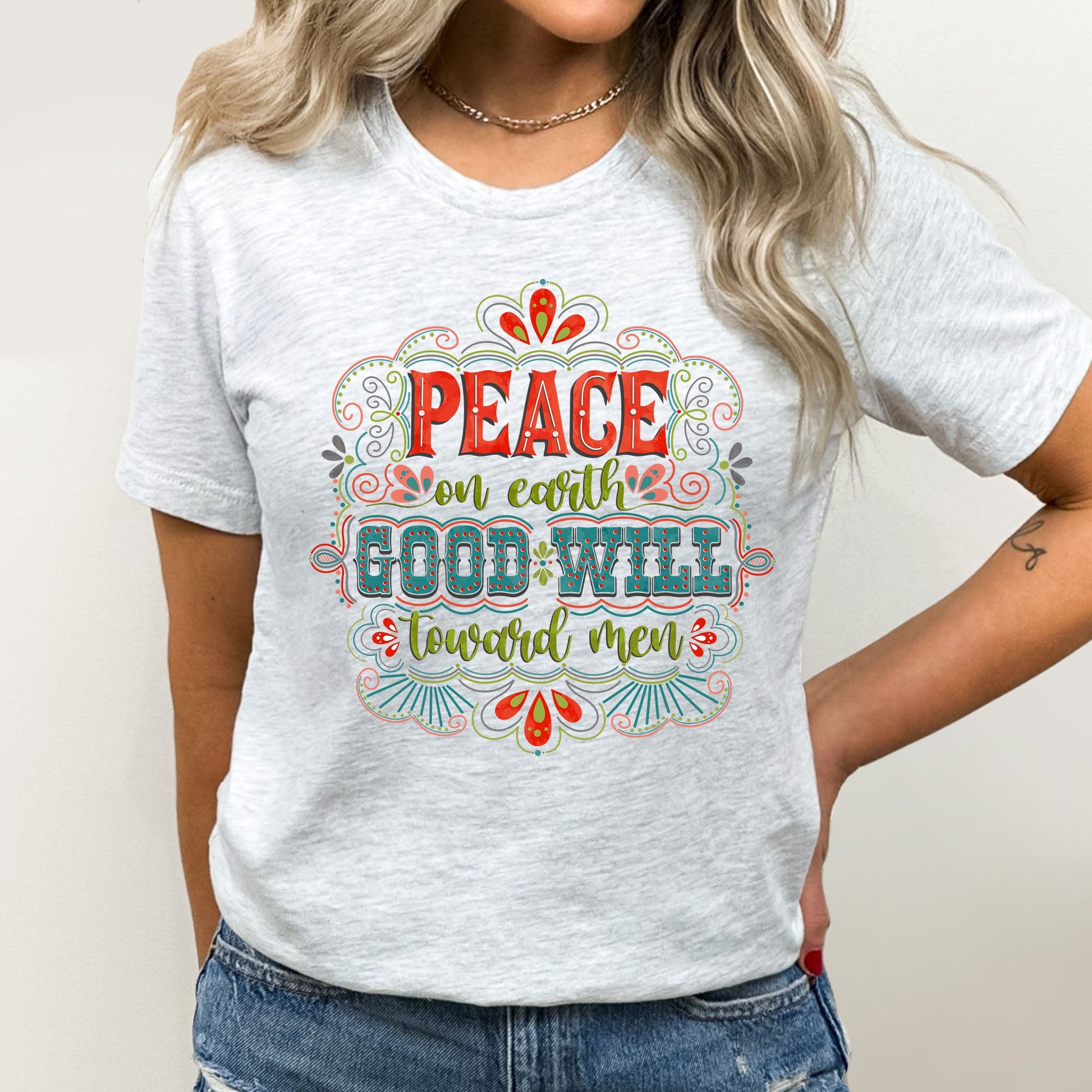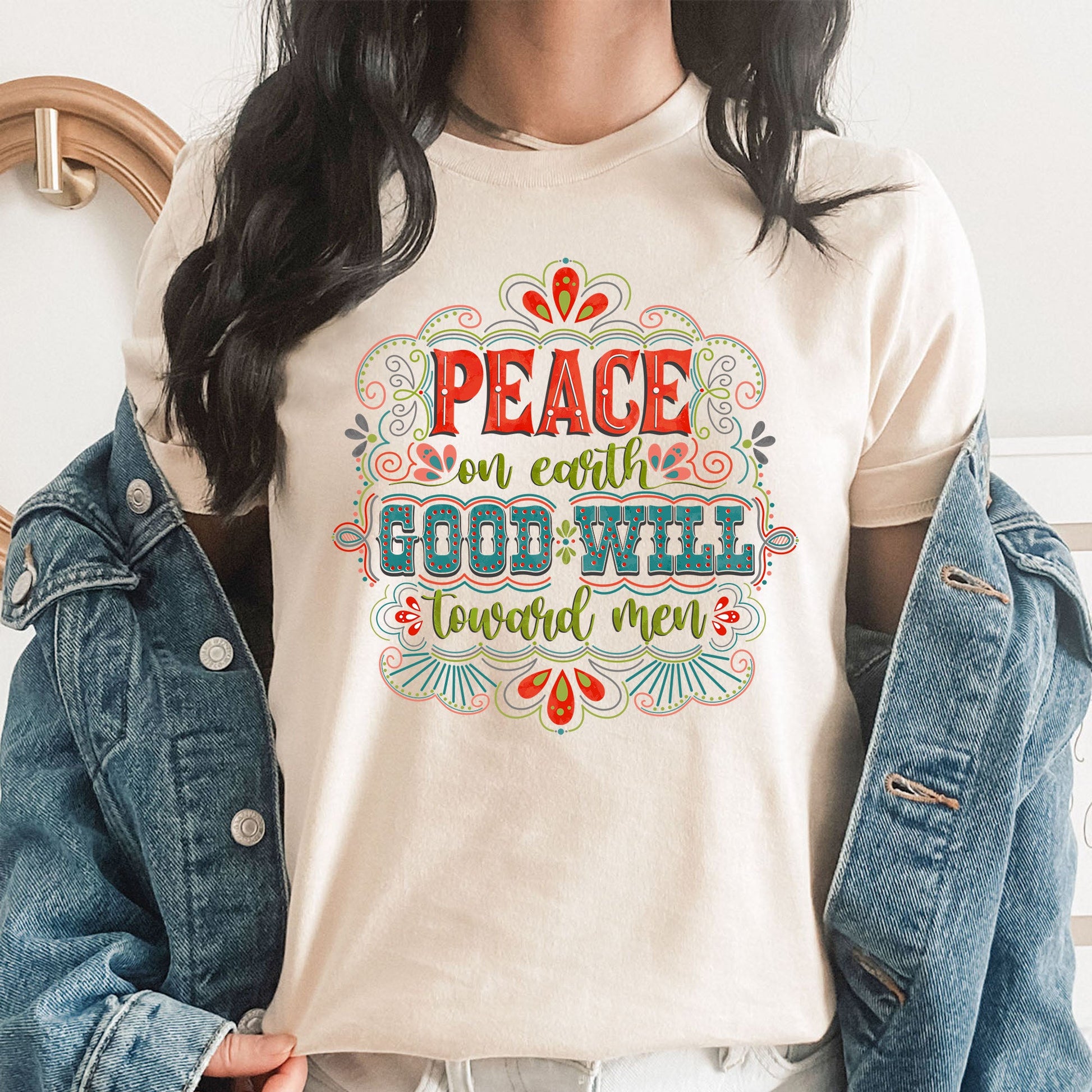Peace On Earth Good Will Toward Men Graphic Tee | Christmas Graphic | Holiday | Song Lyrics | Gospel | Jesus | Decorative Pattern | Layering Tee