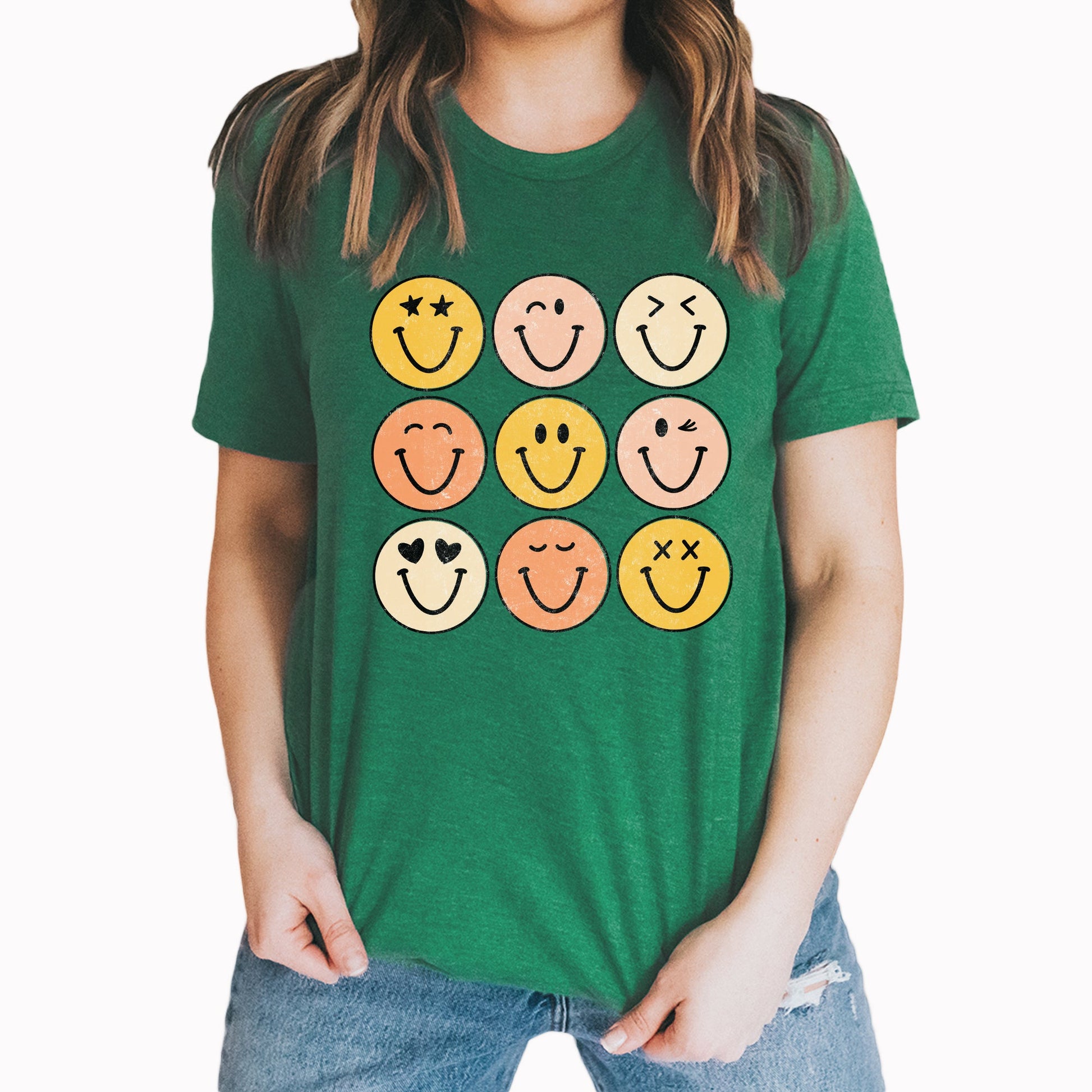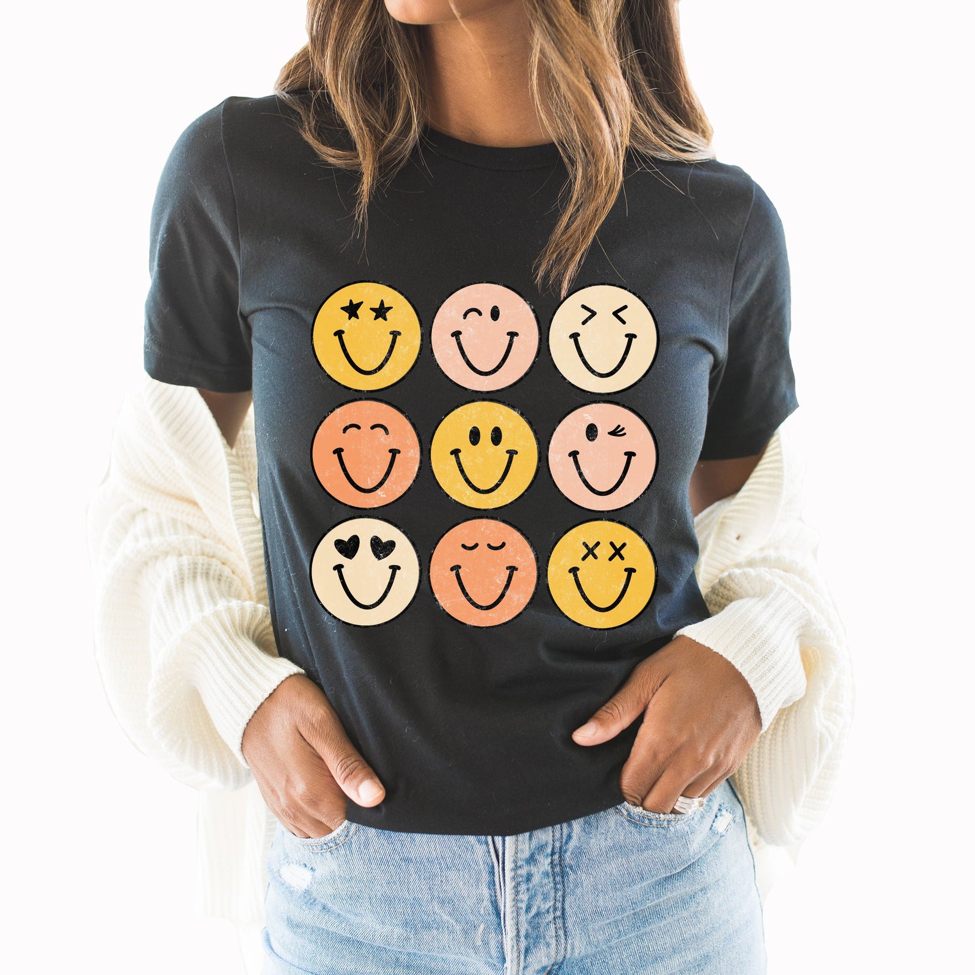 The playful arrangement of smiley faces creates a visually appealing and lively design that is sure to uplift your spirits. This tee is perfect for those who appreciate the power of a smile and want to make a statement about being happy.