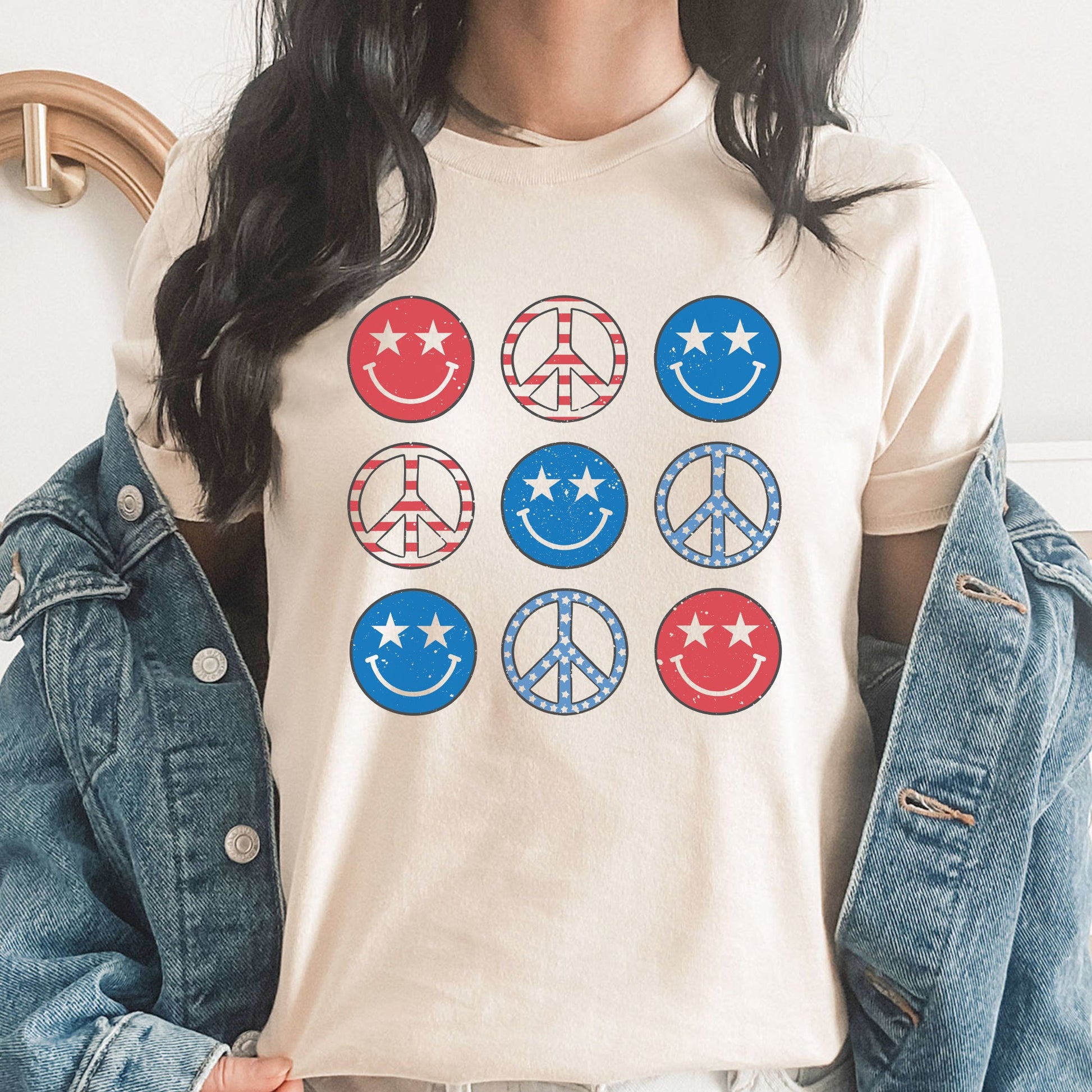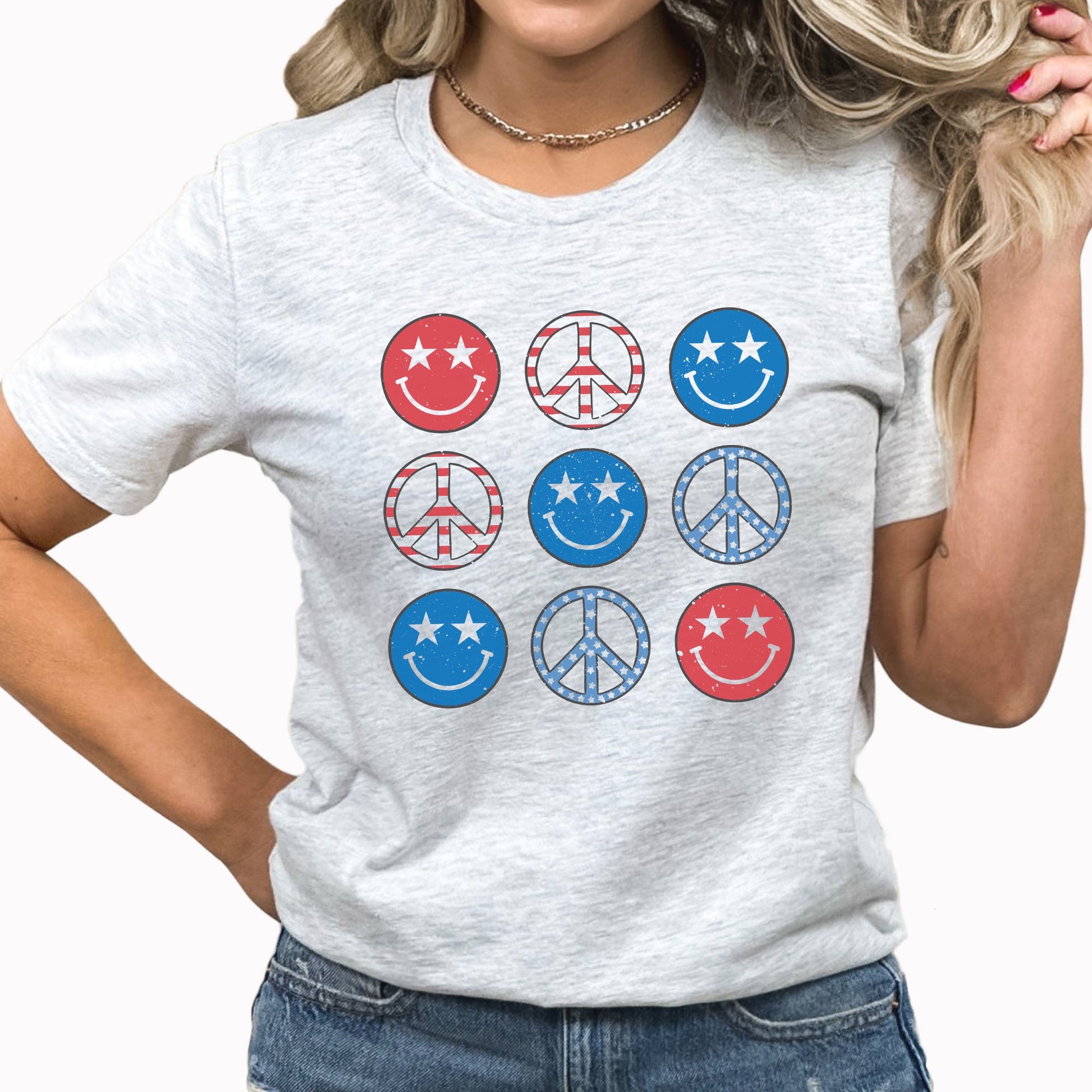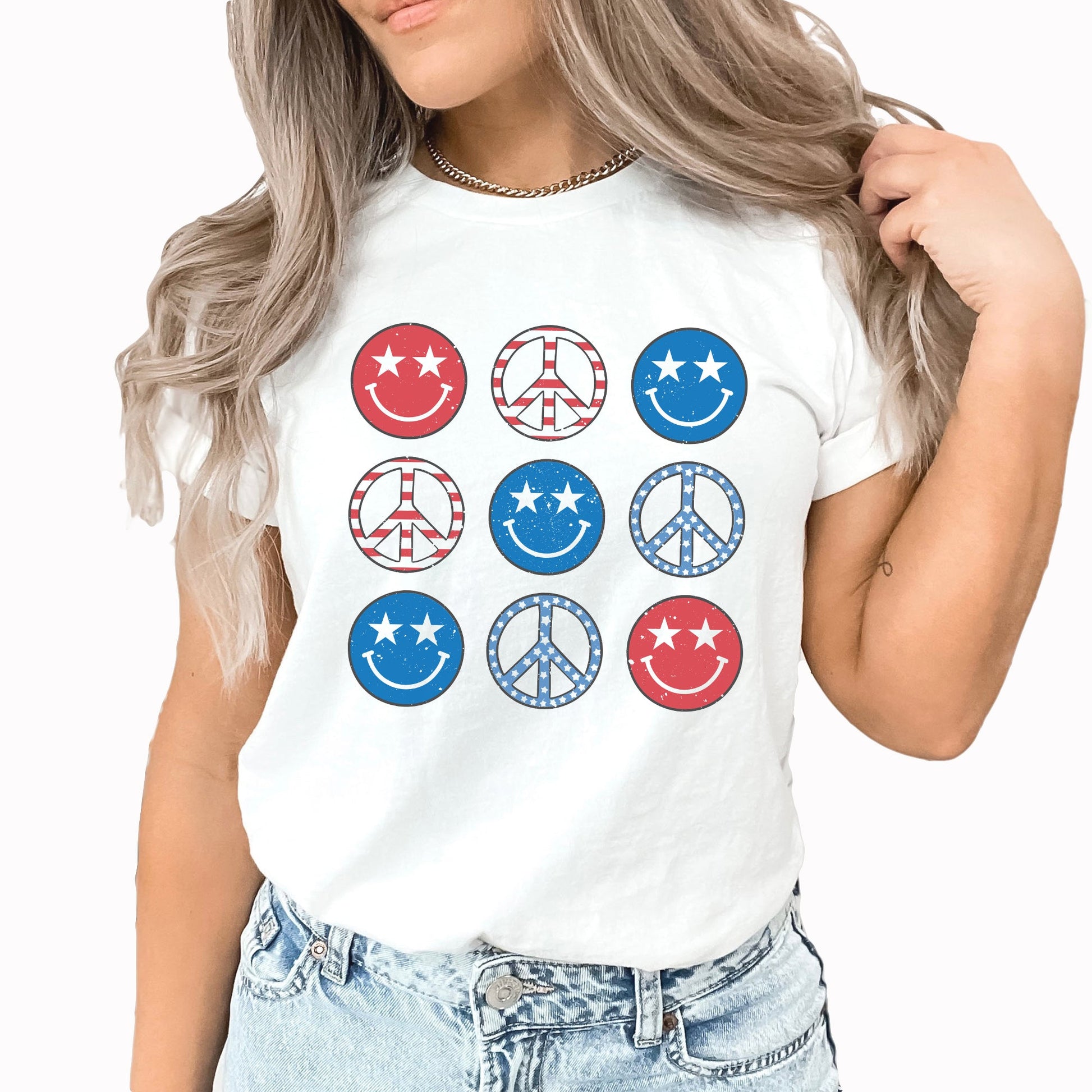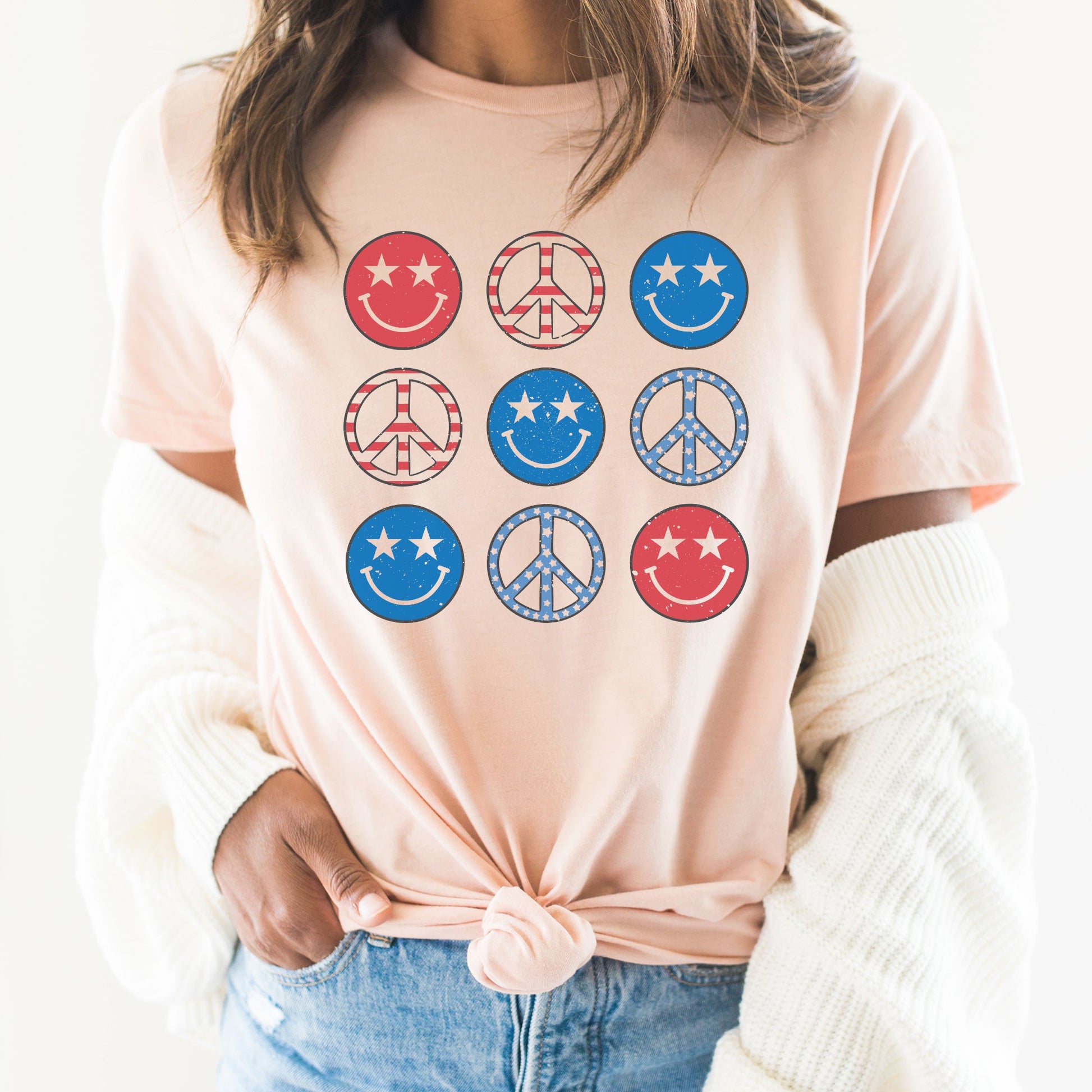 Smiley Peace Grid Graphic Tee | Smiley Face | Peace Sign | American | Independence Day | Patriotic | Stars