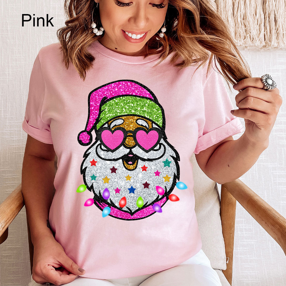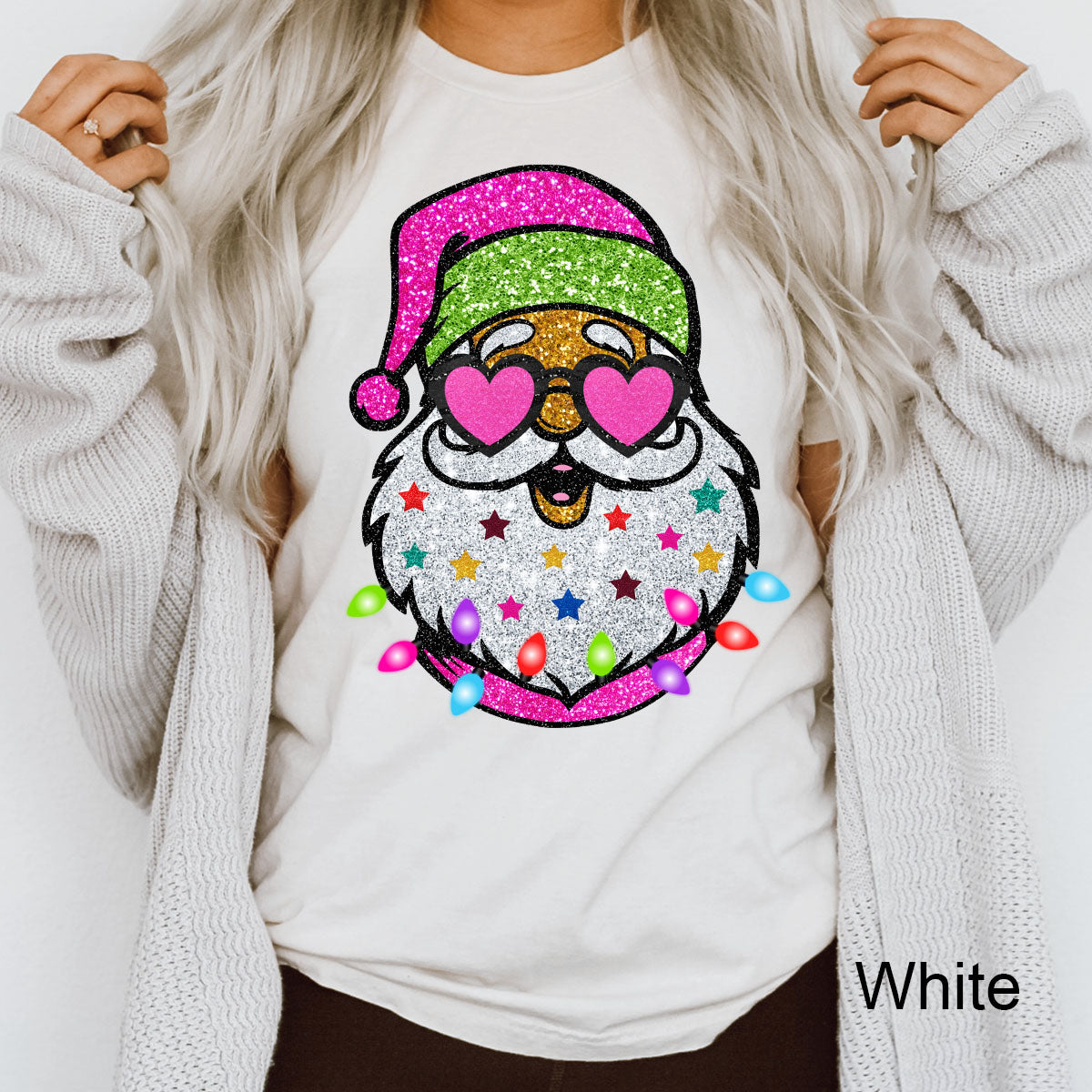 Sparkly Santa Graphic Tee | Faux Glitter Print | Bright Christmas | Glitter Santa | Pink Sparkle | Layering Tee | Holiday Sparkle | Merry And Bright