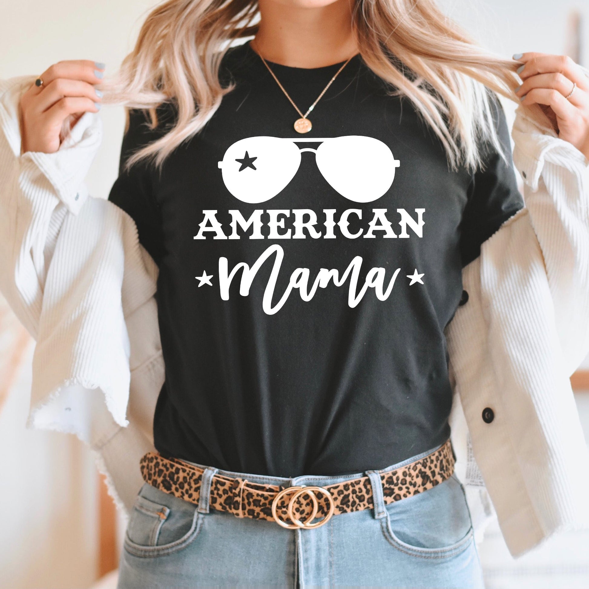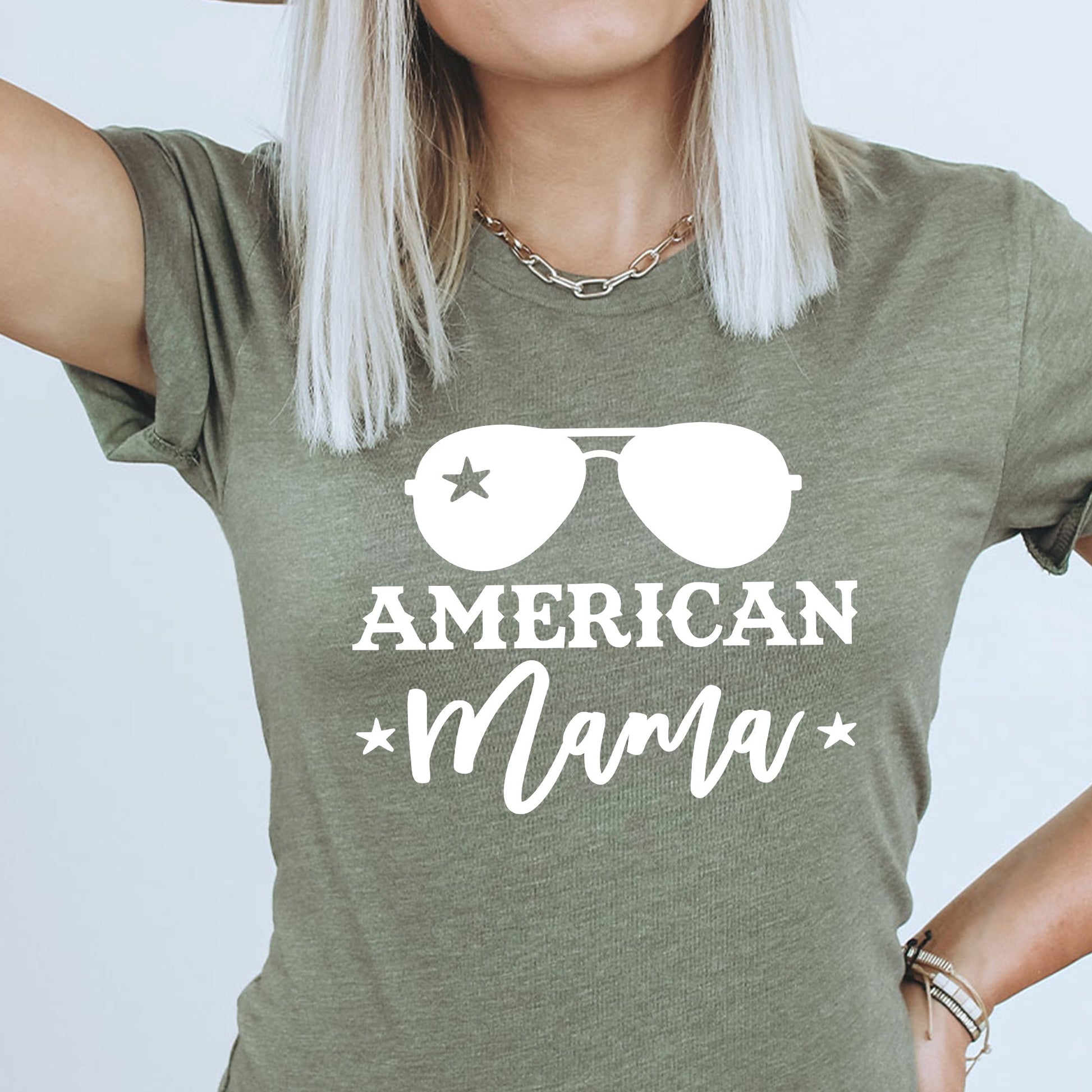 American Mama Graphic Tee |Sunglasses | Patriotic | USA | Stars | Freedom | Layering Tee | Red White Blue