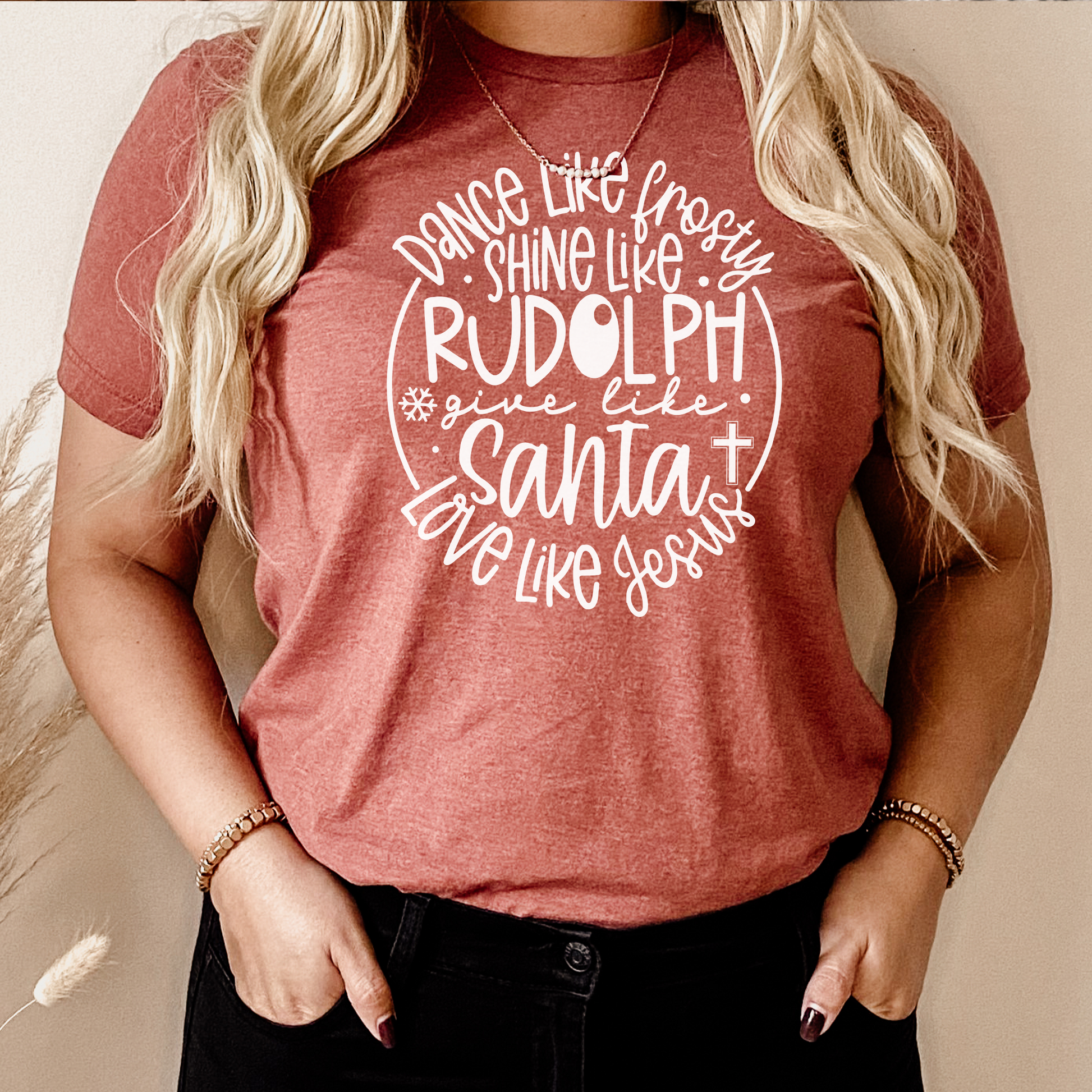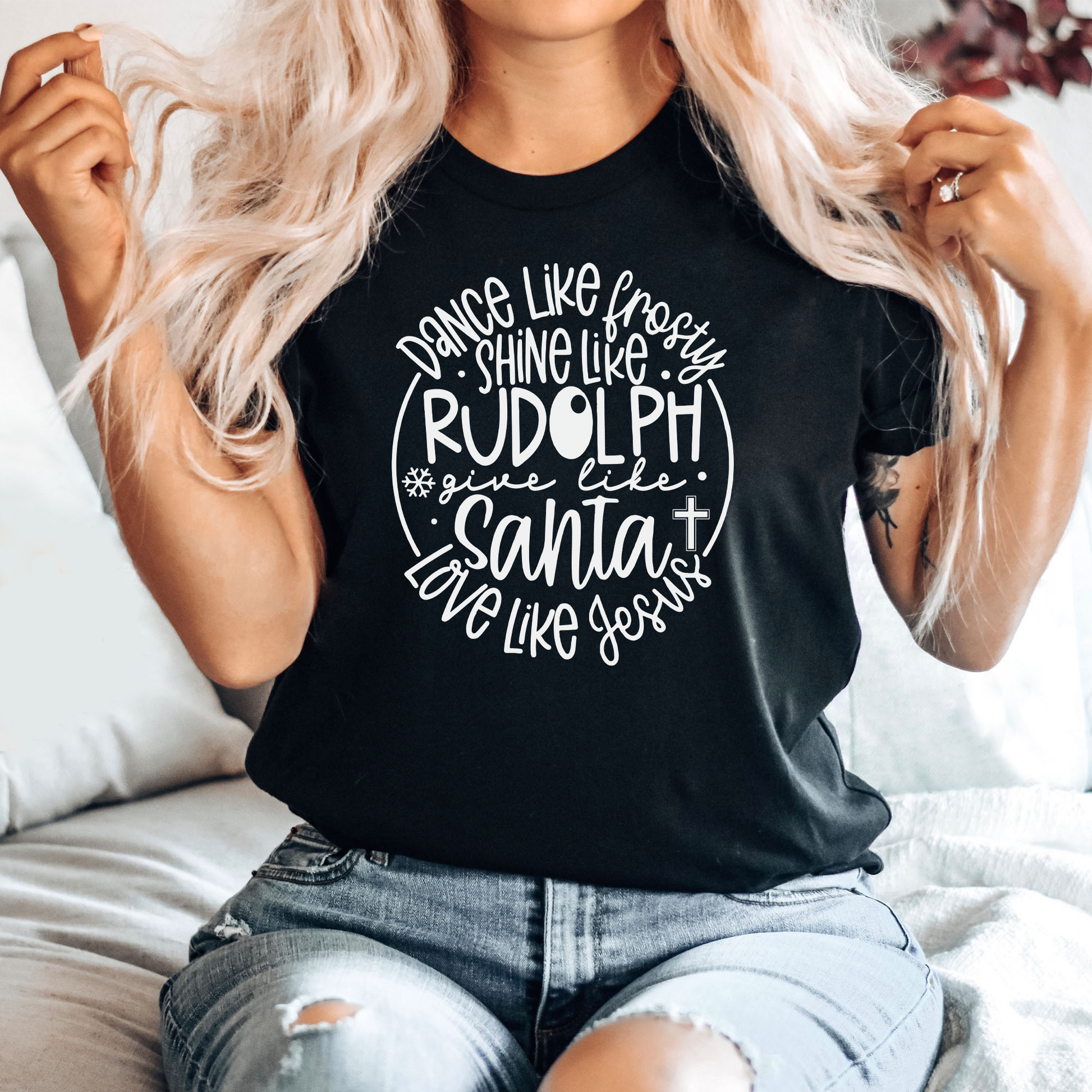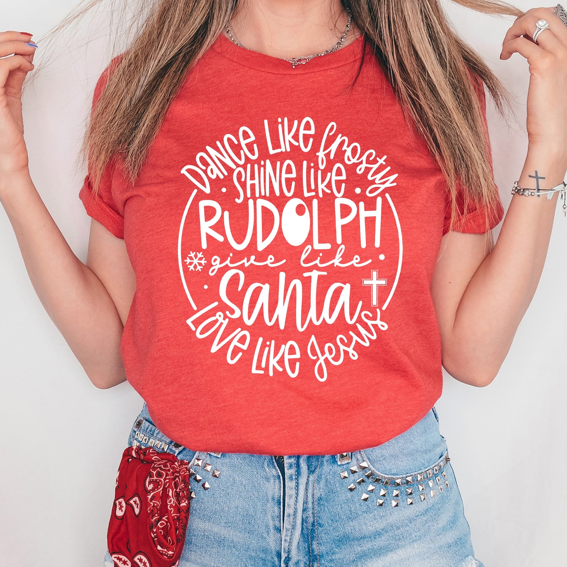 Dance Like Frosty Shine Like Rudolph Give Like Santa Love Like Jesus Graphic Tee | Christmas | Holiday Season | Reindeer | Snowman